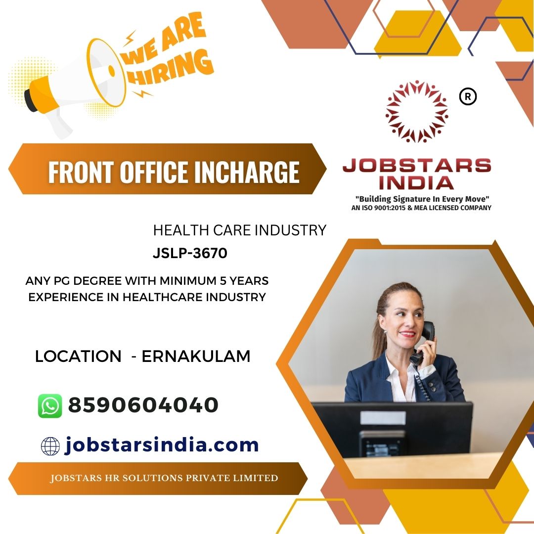 Job Code: JSLP-3670Industry: HealthcareLocation: Ernakulam Job Title: Front Office Incharge Job Description: The Front Office Incharge oversees the front desk operations, ensuring seamless service