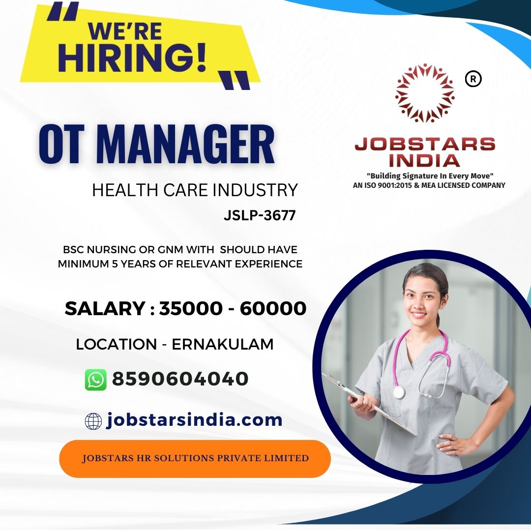 Job Code: JSLP-3677Industry: HealthcareLocation: Ernakulam Job Title: OT Manager Job Description: The Operation Theatre (OT) Manager is responsible for the overall planning, organization, and