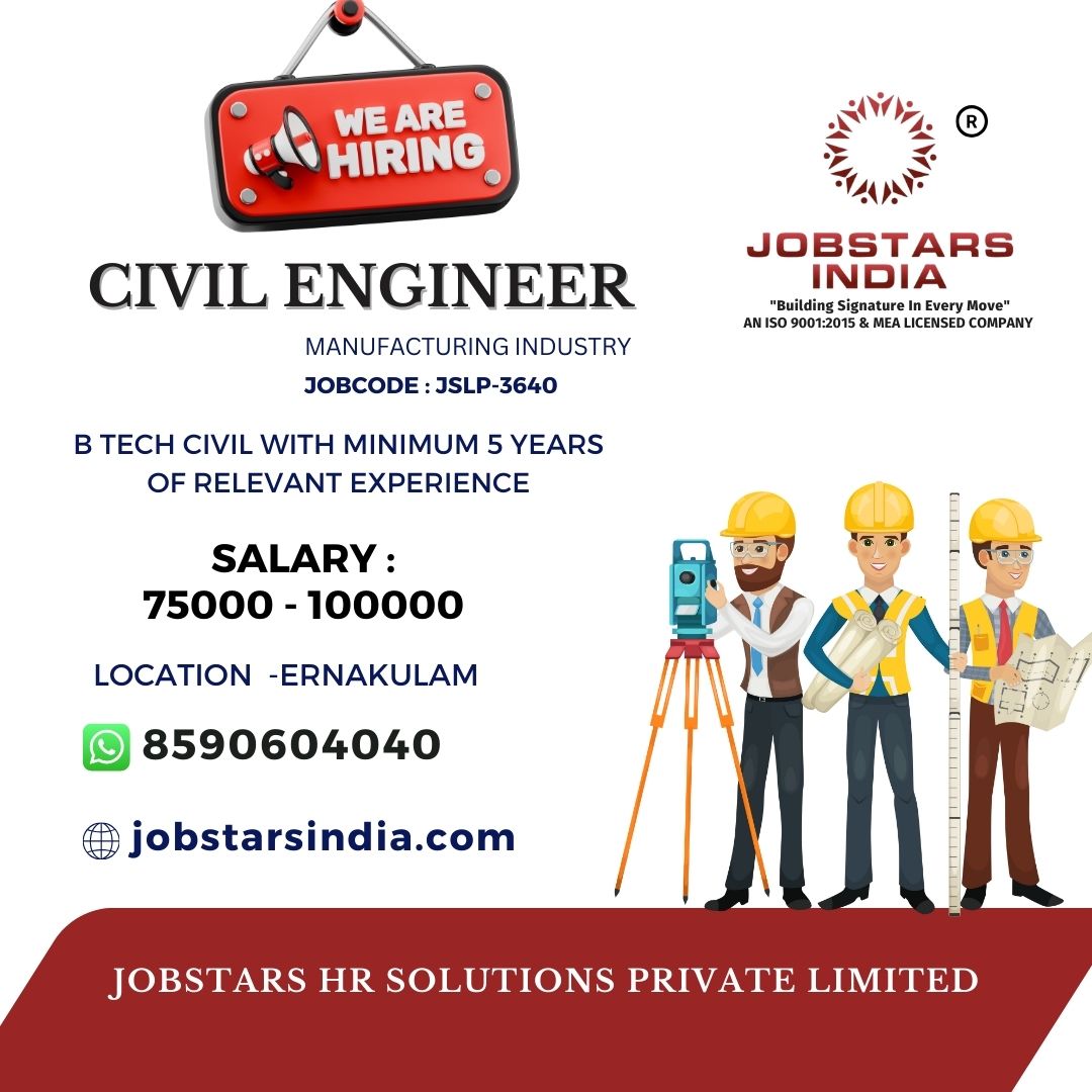 Job Code: JSLP-3640Industry: Manufacturing Location: Ernakulam Job Title: Civil Engineer Job Description: A Civil Engineer is responsible for designing, constructing, and maintaining infrastructure